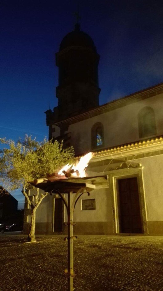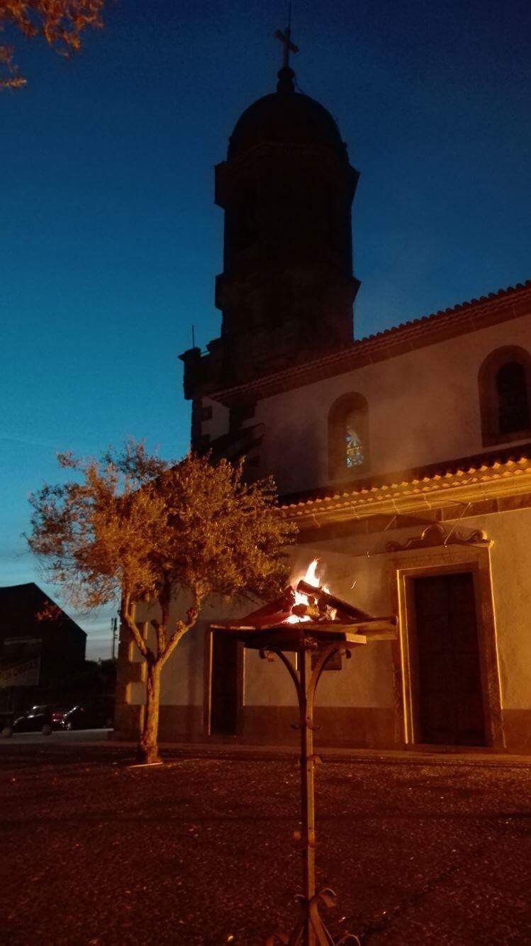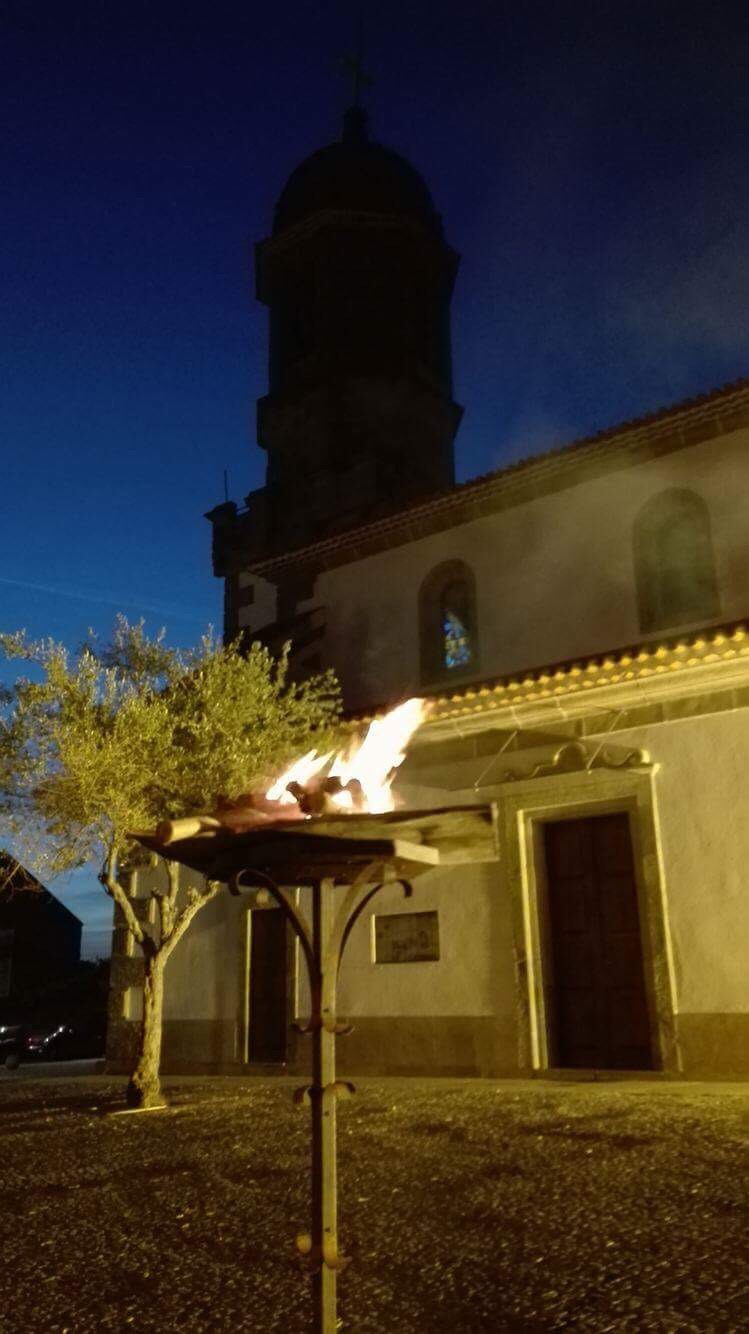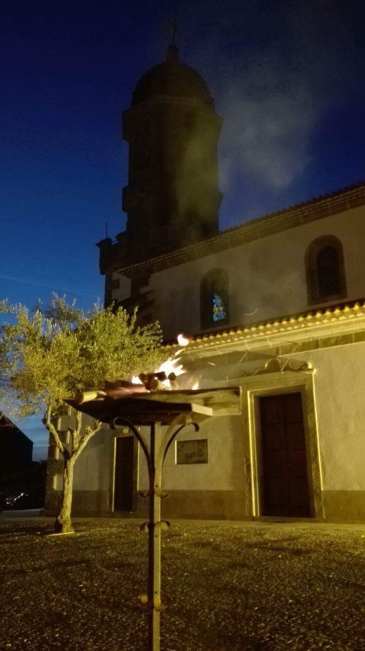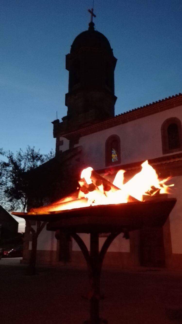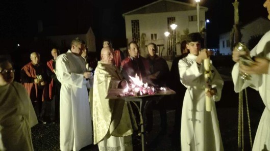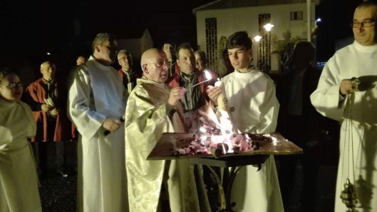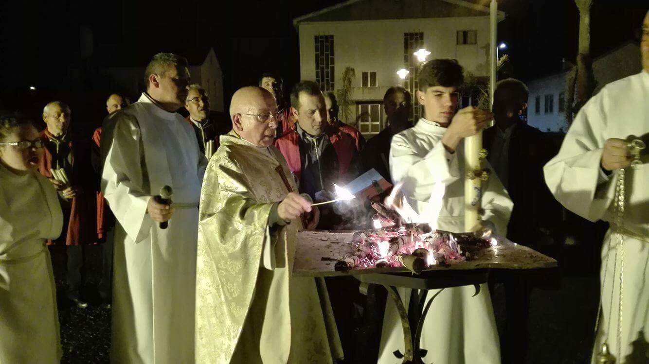 A vigília começa após o pôr-do-sol no Sábado Santo fora da igreja, onde o fogo ou fogueira é abençoada pelo celebrante.