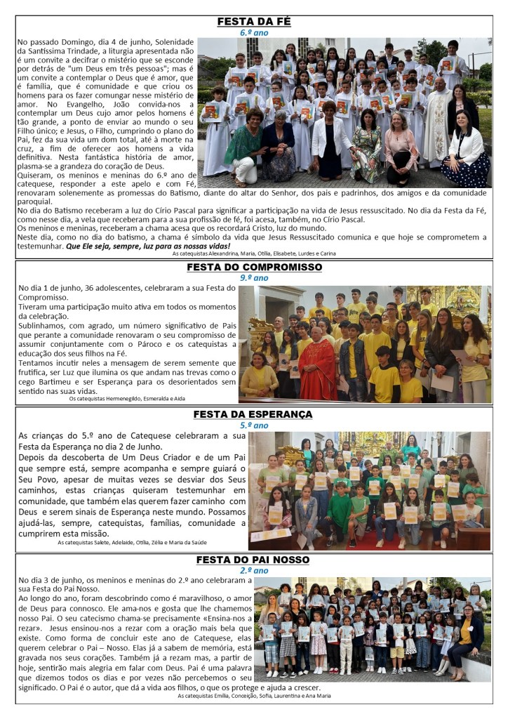 As crianças do 5.º ano de Catequese celebraram a sua Festa da Esperança no dia 2 de Junho. Depois da descoberta de Um Deus Criador e de um Pai que sempre está, sempre acompanha e sempre guiará o Seu Povo, apesar de muitas vezes se desviar dos Seus caminhos, estas crianças quiseram testemunhar em comunidade, que também elas querem fazer caminho com Deus e serem sinais de Esperança neste mundo. Possamos ajudá-las, sempre, catequistas, famílias, comunidade a cumprirem esta missão.